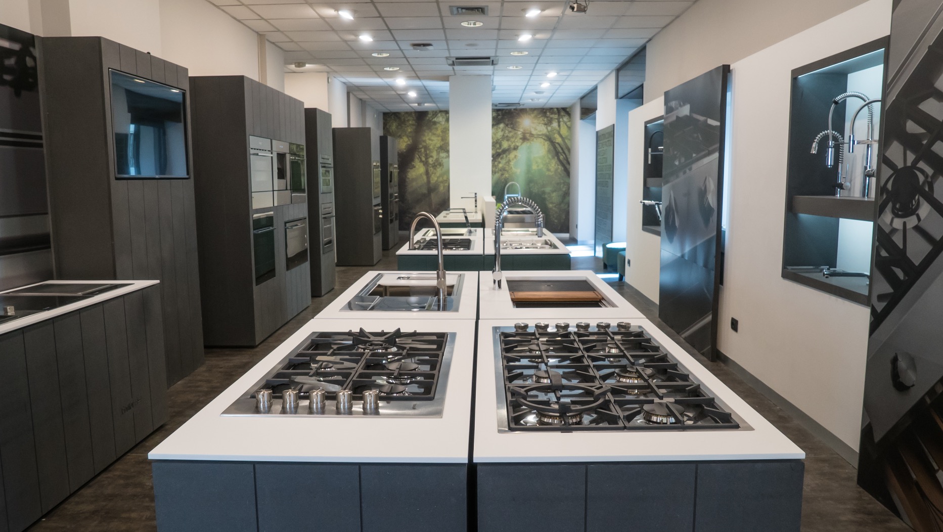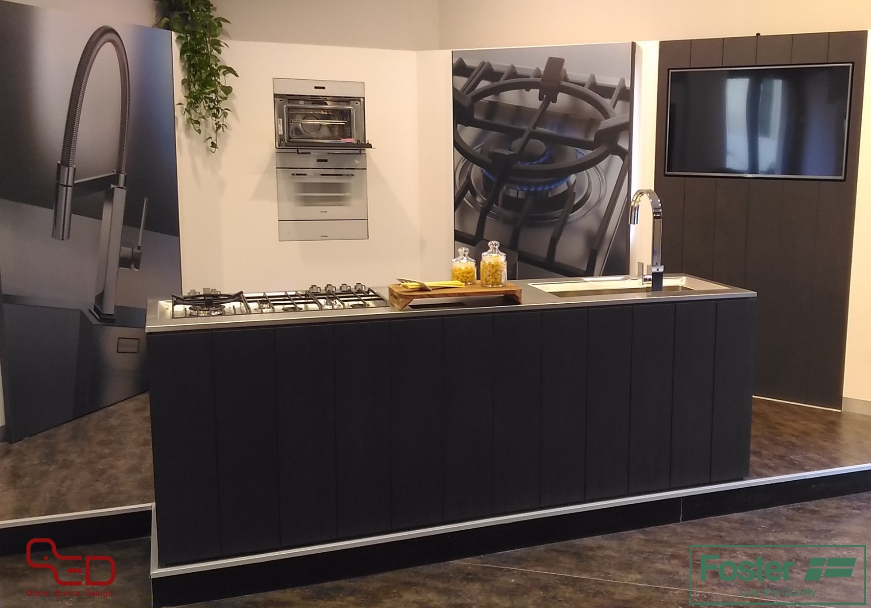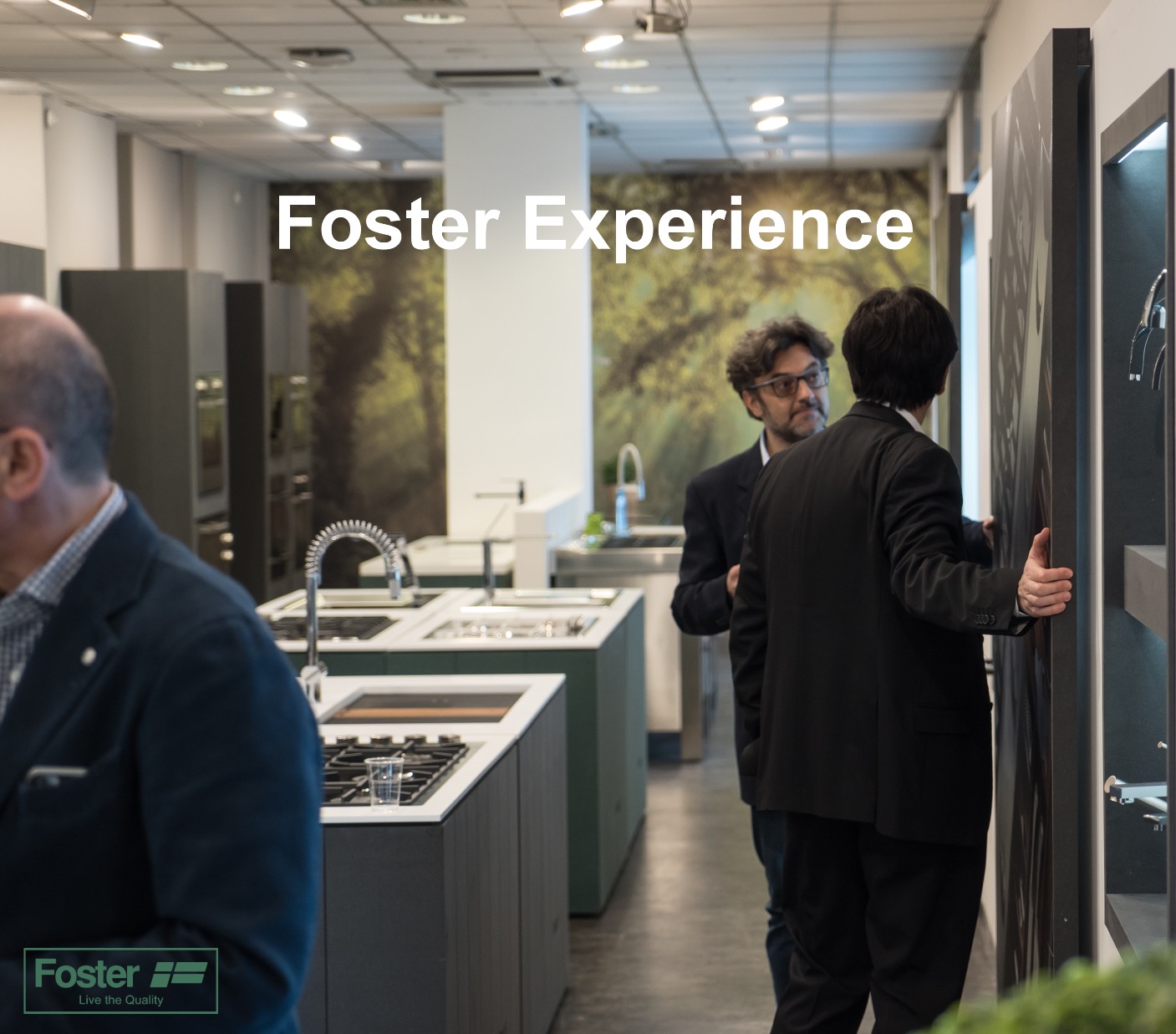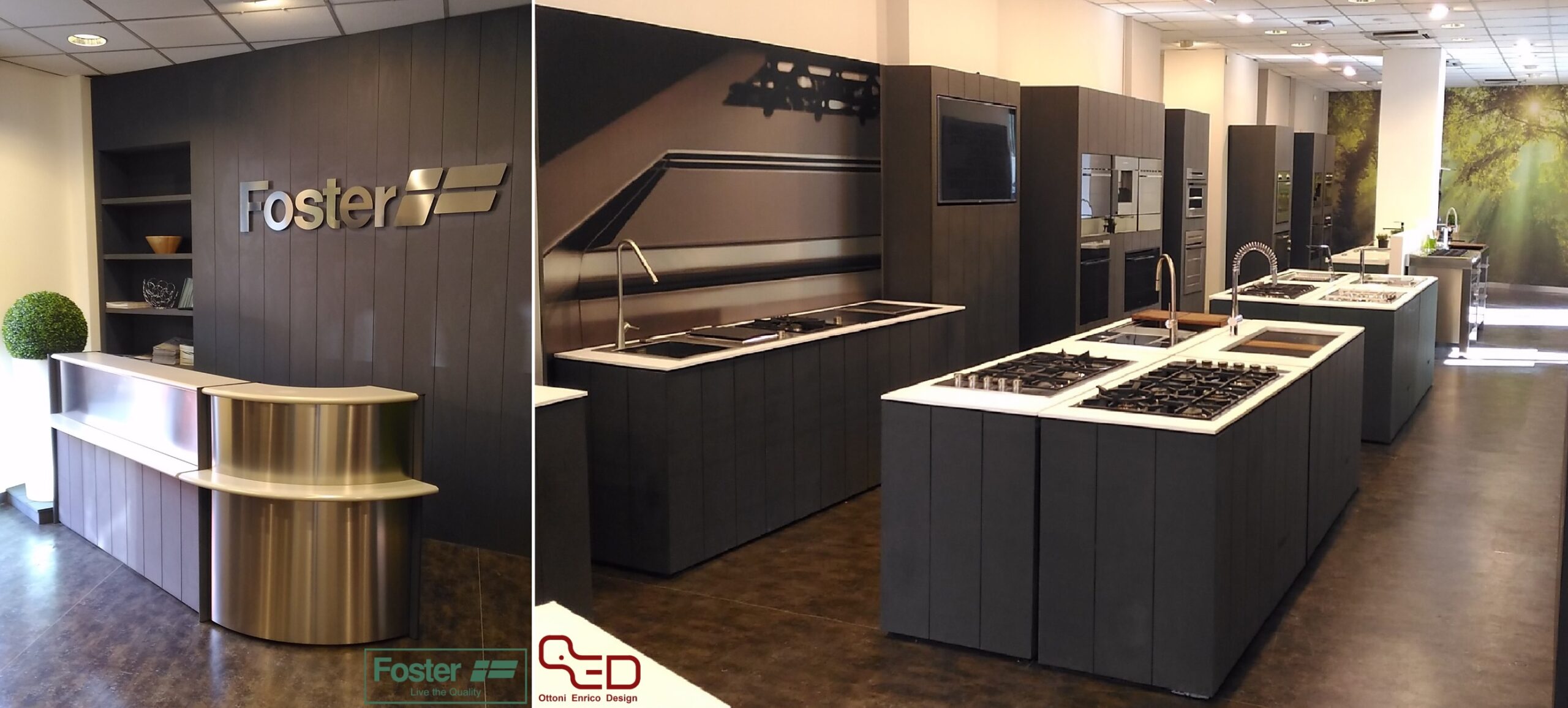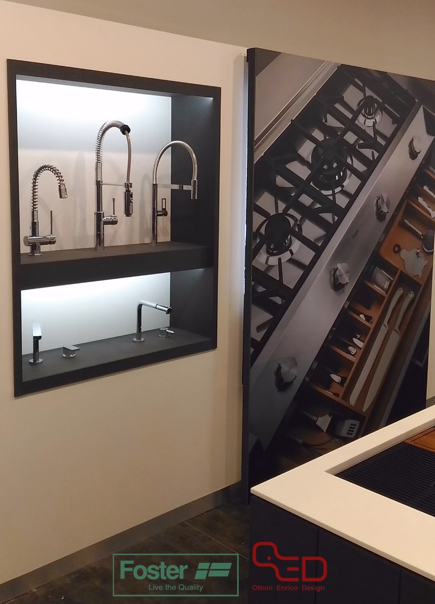Dalla collaborazione con l’Area Progettazione Foster, ed in particolare con l’Ing. Cesare Bonardi, è nato il progetto dell’allestimento del nuovo Showroom Foster. E’ situato in via San Marco 12, all’angolo con via Goito. Al suo interno possiamo trovare, esposti, tutti i principali prodotti di punta dell’azienda; distribuiti tra un open space e due sale interne. I vari elettrodomestici sono installati su strutture in valcromat dai colori verde e grigio antracite. Inoltre, sono presenti anche delle nicchie con esposti tutti i rubinetti da abbinare ai vari lavelli in acciaio.